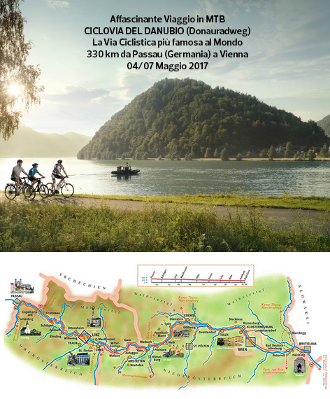 04/07 Maggio 2017 Meraviglie d'Europa in MTB: CICLOVIA DEL DANUBIO (Donauradweg) da Passau (Germania) a Vienna, 330 km in un affascinante tracciato tra natura, arte, storia, cultura e tradizioni. Itinerario: Passau, Linz, Campo oncentramento di Mauthausen, Abbazia di Melk, Venere di Willendorf, Stein, Krems, Abbazia di Gottweig, Vienna.