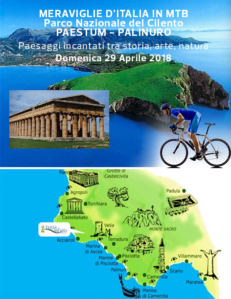 Domenica 29 Aprile 2018 MTB Parco Naz.del Cilento - PAESTUM - PALINURO Itinerario: • Paestum • Agropoli • Castellabate • Licosa • Agnone • Acciaroli • Ascea • Pisciotta • Palinuro